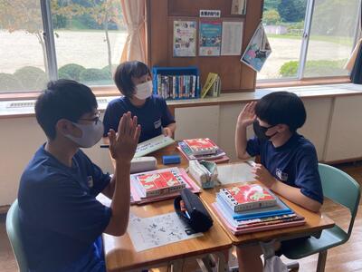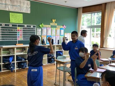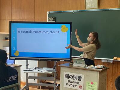 単語を並べ替えて正しい英文を作ったり、完成した英文を読んだりと、グループ対抗でポイントを競いながら、楽しく復習をしていました。Sydney先生の英語での問いかけにも元気に反応しています。