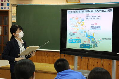地区の保健福祉センターと市役所健康づくり推進課より講師の方にお越しいただき、生活習慣病の種類や原因、予防するための食生活のポイントや生活習慣について、お話ししていただきました。