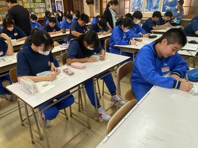 9月28日、3年生は、市内3つの事業所で、仕事の一部を経験させていただきました。業種は違いますが、どの事業所でも、教えていただいたことを覚え、実践しようと真剣に取り組んでいました。