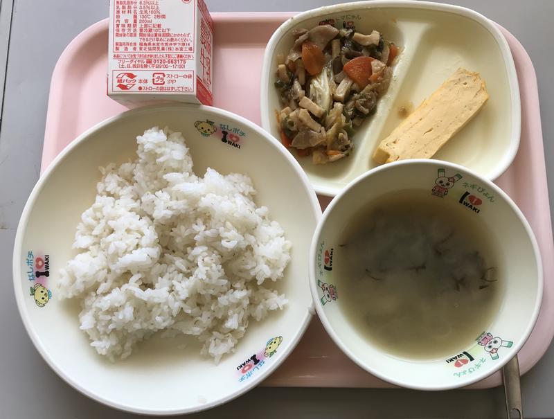 野菜たっぷり豚丼 厚焼き卵 もずくと豆腐の味噌汁 牛乳 (766キロカロリー)