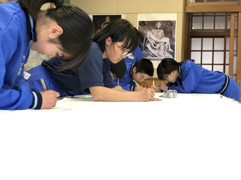 一枚の白布に、鉛筆書きで下絵を写していきます。どの生徒も楽しくそして真剣に取り組んでいます。どんな横断幕になるか、楽しみです!