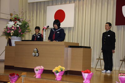 生徒代表発表では、生徒会、2年生代表、3年生代表がそれぞれ抱負を述べました。新学年、新役職での「自覚」を、昨年の反省を交えて発表しました。