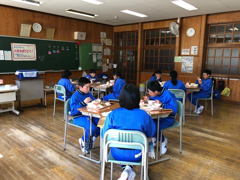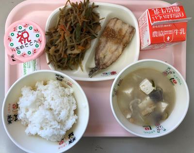 4月9日の給食は、ご飯、牛乳、鰯の揚げ浸し、きんぴらごぼう、呉汁、お祝いゼリー。よくかんで食べると集中力が高まりますよ!
