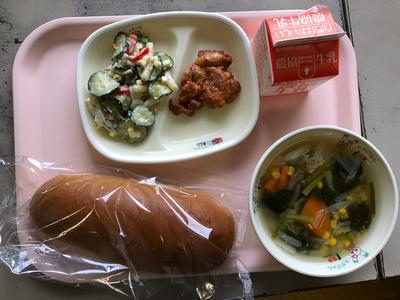 4月10日の給食は、黒糖パン、牛乳、鶏肉のガーリック焼き、マカロニサラダ、野菜スープです。黒糖パン、ちょうど良いしっとりとした甘さで、美味しかったです!
