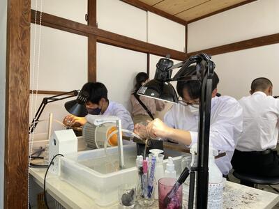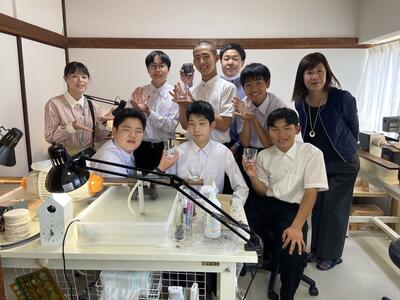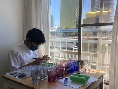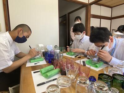 好きなグラスを選び、星や自分で考えたデザインを削ります。黙々と集中して削る姿は真剣そのもの。個性溢れるオリジナルのグラスが完成しました。