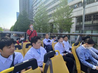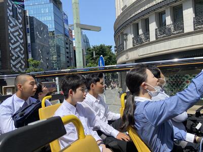 皇居に始まって、国会議事堂や霞ヶ関の中央省庁、銀座の街並み等、東京の名所を、ガイドさんのアナウンスを聞きながら1時間かけて巡りました。