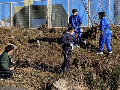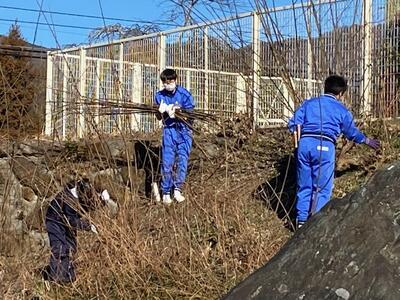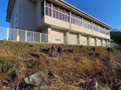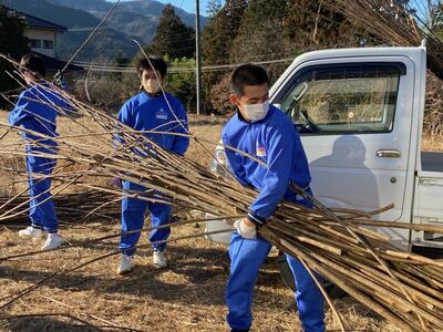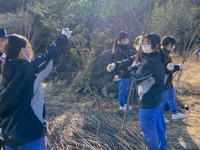 2023年1月20日 15時36分本日5・6校時の総合的な学習の時間に、1・2年生が「楮刈り体験」を行いました。来週は「紙漉き体験」を行いますが、その前段として、本校体育館裏手の斜面に生えている、和紙の原料になる楮を刈り取る活動です。