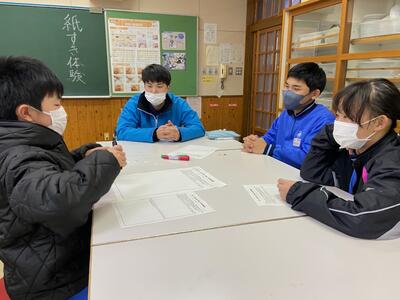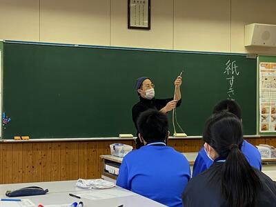 2023年1月27日 16時09分先週の楮刈り体験に引き続き、本日5・6校時の総合では、1・2年生が和紙づくりの最終段階、「紙漉き」を体験しました。