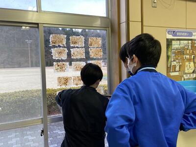 遠野紙子屋の平山さんから、遠野和紙の歴史等について教えていただいた後は、早速活動に取り掛かります。まず始めに、和紙を飾る色紙の形や配置等、オリジナルのデザインを考えます。次に、繊維状になった楮(の黒皮)と水を混ぜ合わせたものを、型の中で数回揺らして水分を落とした後、型から外し脱水して窓ガラスへ。このまま天日で完全に乾燥するのを待ちます。