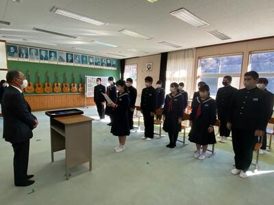 2023年3月23日 14時06分本日修了式を行い、代表生徒に修了証書を授与しました。