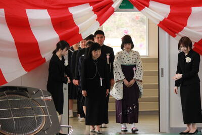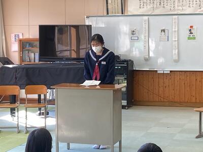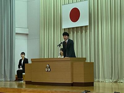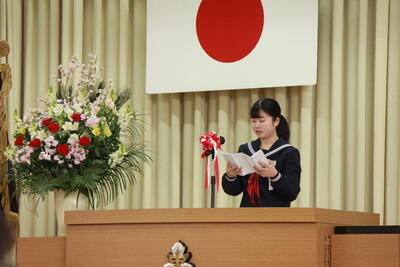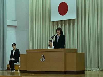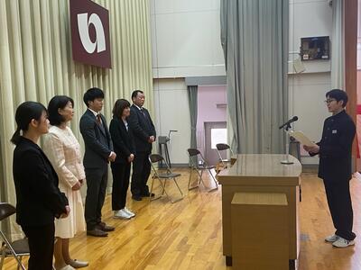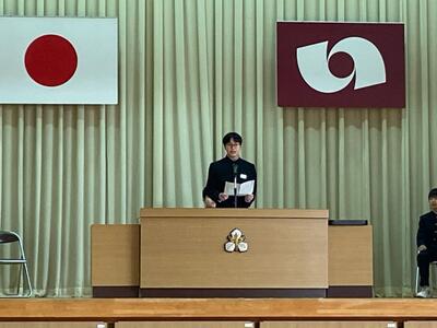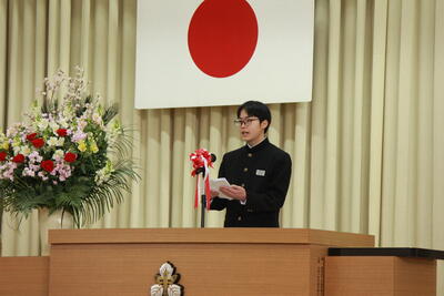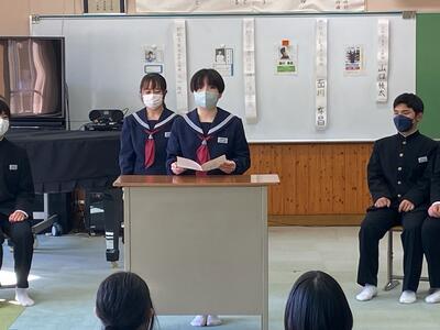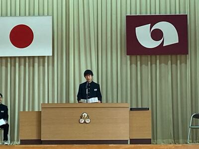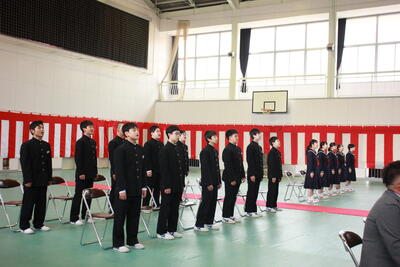 同窓会長様からのごあいさつの中では、入遠野の地区名にまつわる興味深いお話しや、失敗を恐れず勇気を持ってチャレンジしてほしいという力強いメッセージをいただきました。最後に代表生徒が、「入遠野中学校の卒業生として母校の名を汚さぬよう、精一杯努力していきます」と、誓いのことばを述べました。