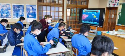 2023年2月24日 14時57分今日は、シドニー先生の今年度最後の来校日。5校時に、全学年合同で「kahoot!」という活動を行いました。