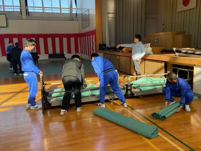 1・2年生で体育館に敷いてあったシート等を片付けました。少ない人数でしたが、声をかけ合いながら協力して手際よく作業し、あっという間に終了しました。