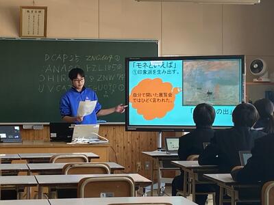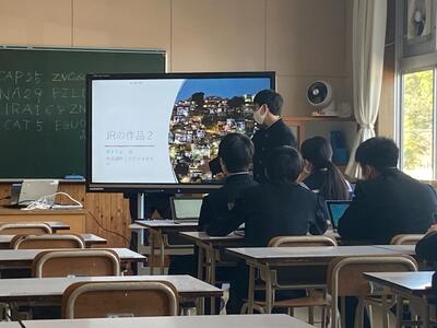2023年3月22日 12時41分本日3校時の美術の授業は1・2年生合同で行い、画家や絵画・写真等の作品について紹介し合いました。選んだテーマは時代を代表する有名画家から現代アーティストまで様々で、発表の仕方も聴き手を意識して工夫されており、充実した発表会になりました。