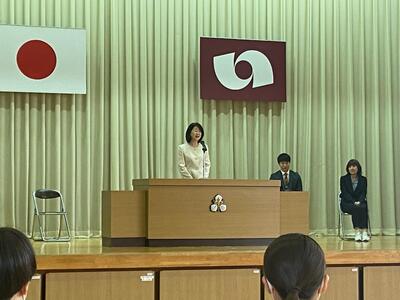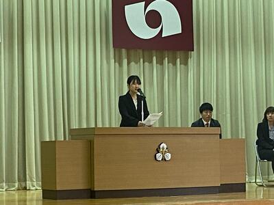 すべての役職において定数ちょうどの立候補者数のため投票は行いませんでしたが、各候補者は、立候補した動機や役員として実現したいことを、自分なりの思いを込めて力強く述べました。応援演説を行った生徒もそれぞれの支持する候補者のために、精一杯のエールを送りました。