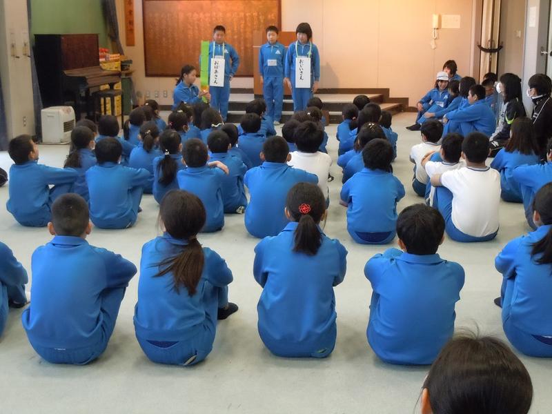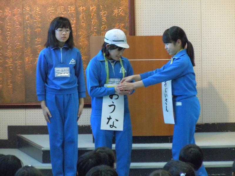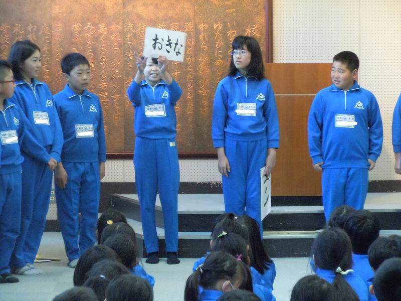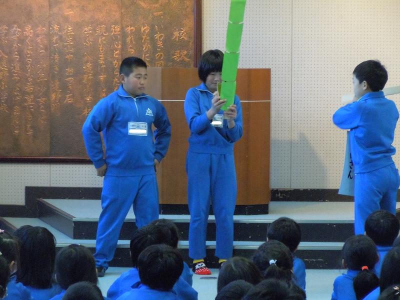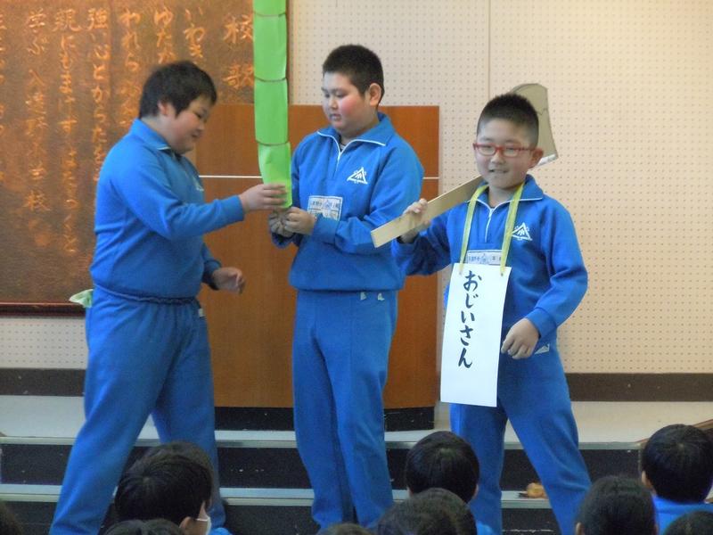 まずは、昔の言葉で綴られた原文を暗記し、動作も加えて発表した後、今度は現代語訳で同じ発表をしたものでした。小さい学年にも分かりやすく、おまけに昔の言葉についてもふれることができ、大変内容の濃い発表となりました。