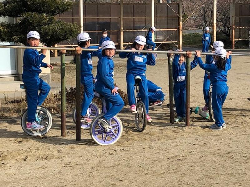 2年生は、にぎやかに一輪車の練習。5年生は陸上のスキルトレーニング。他の学年の子ども達も思い思いに過ごしています。