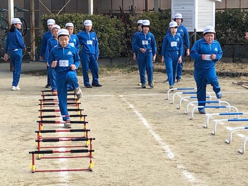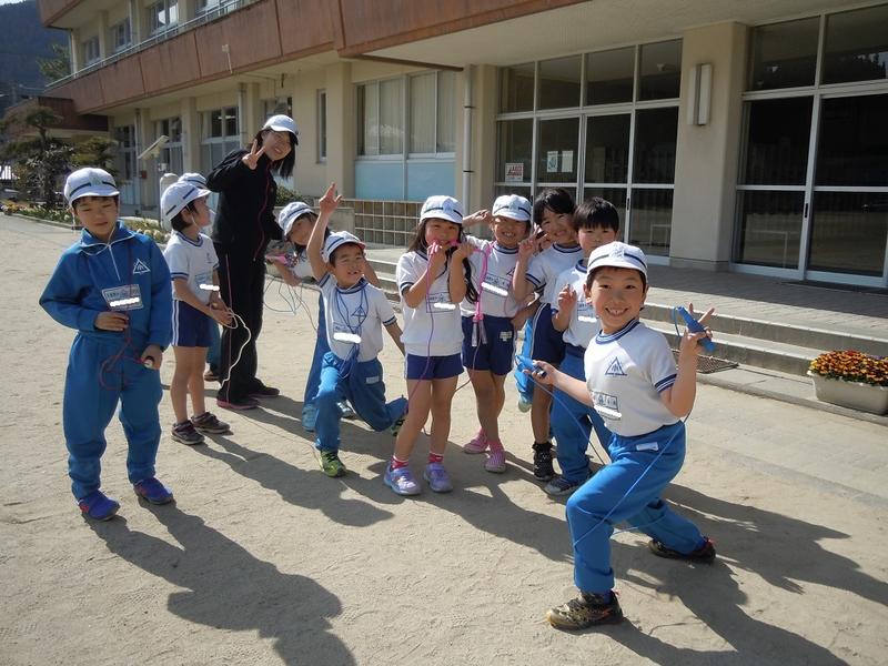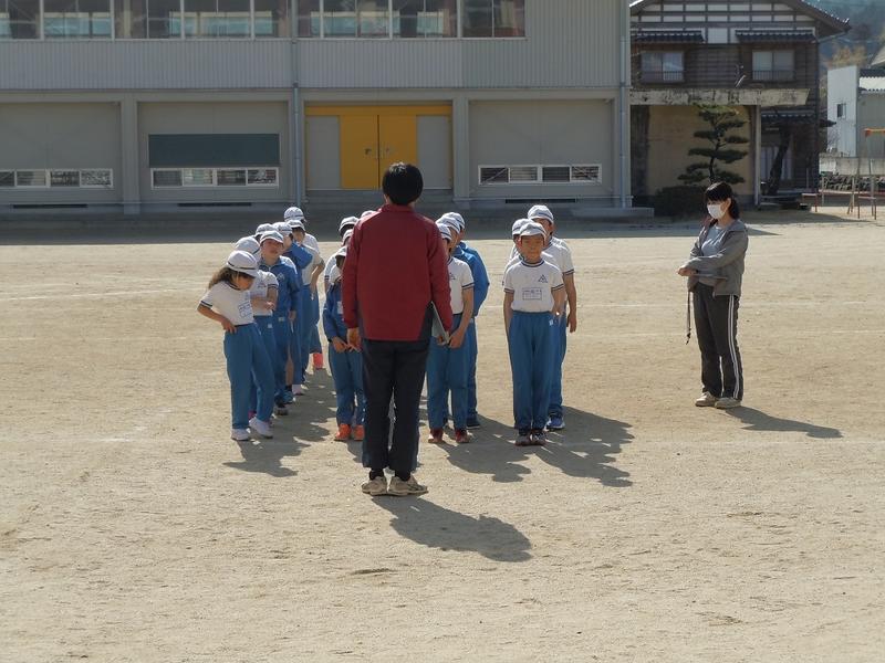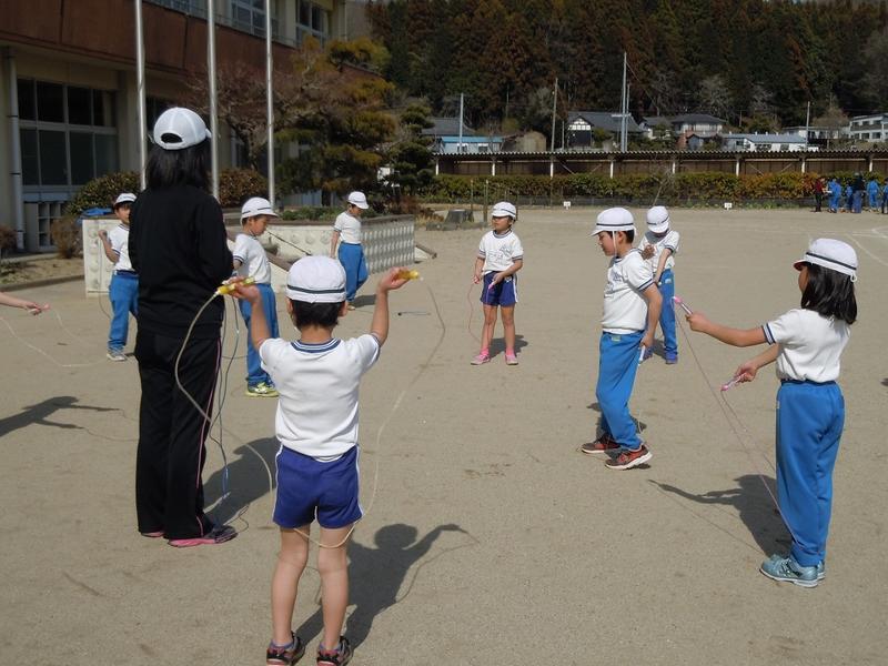 6年生は、いつも通り校庭を走り終えると、1年生と談笑しながらなわとびを披露。