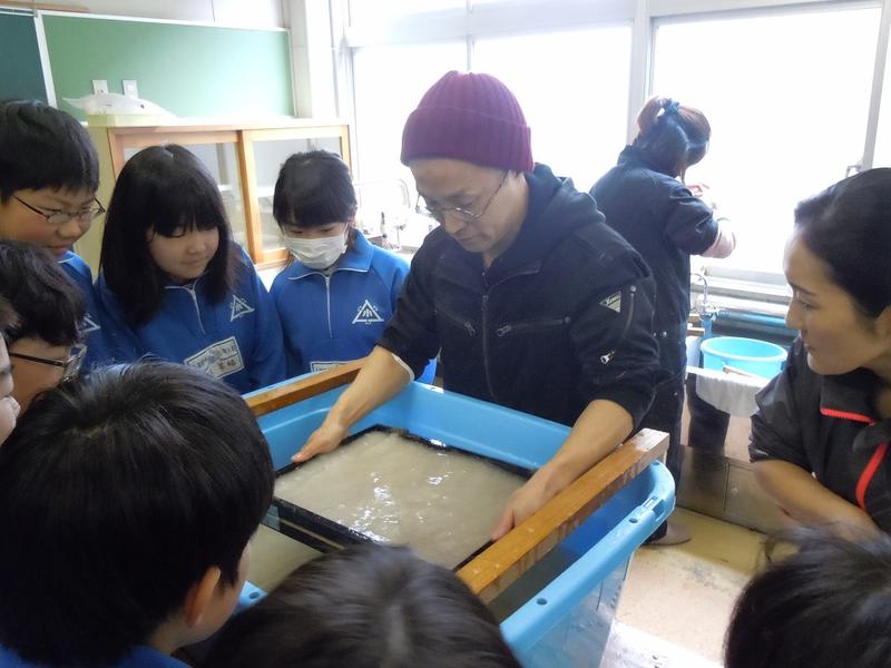 地域おこし協力隊の,平山様ご夫妻を講師に、遠野和紙の歴史や作り方を教わった後は、いよいよ実践。