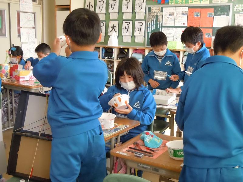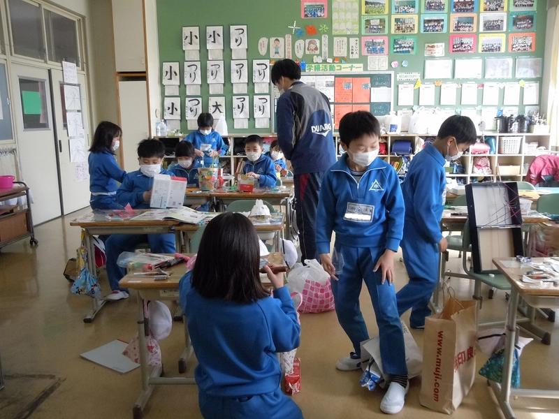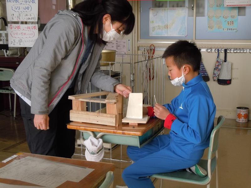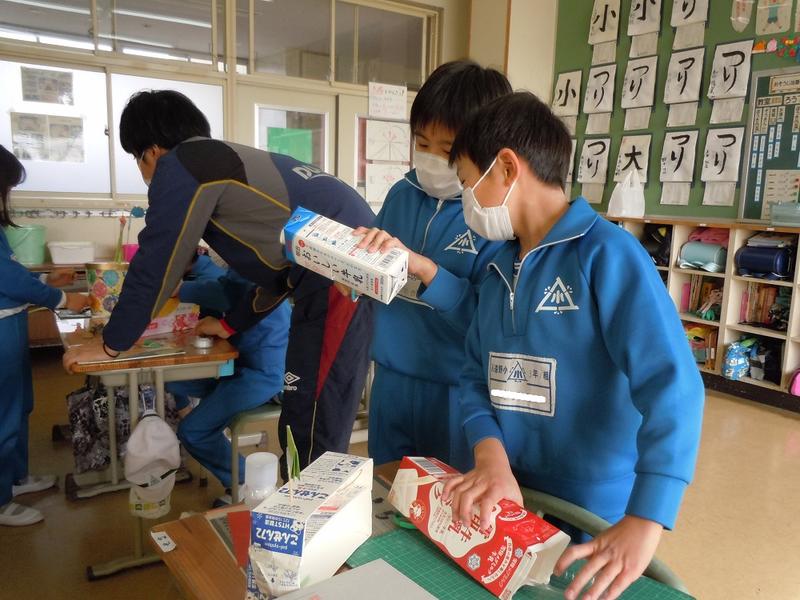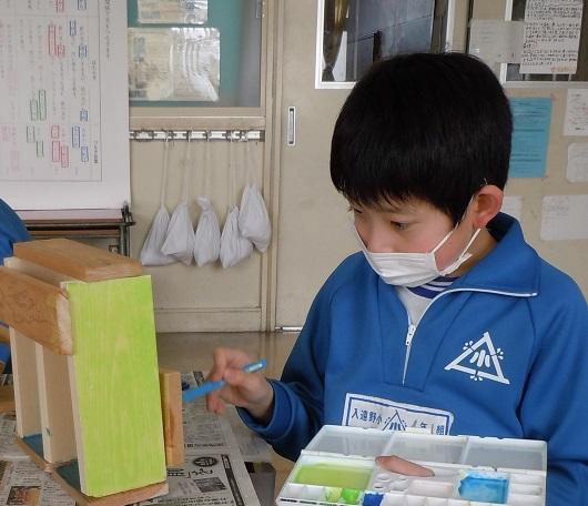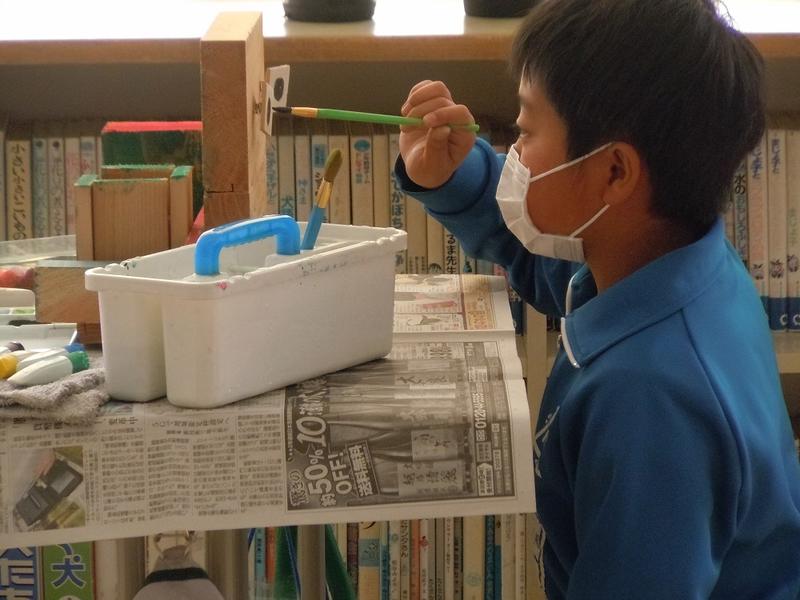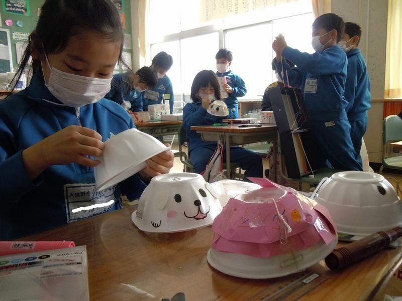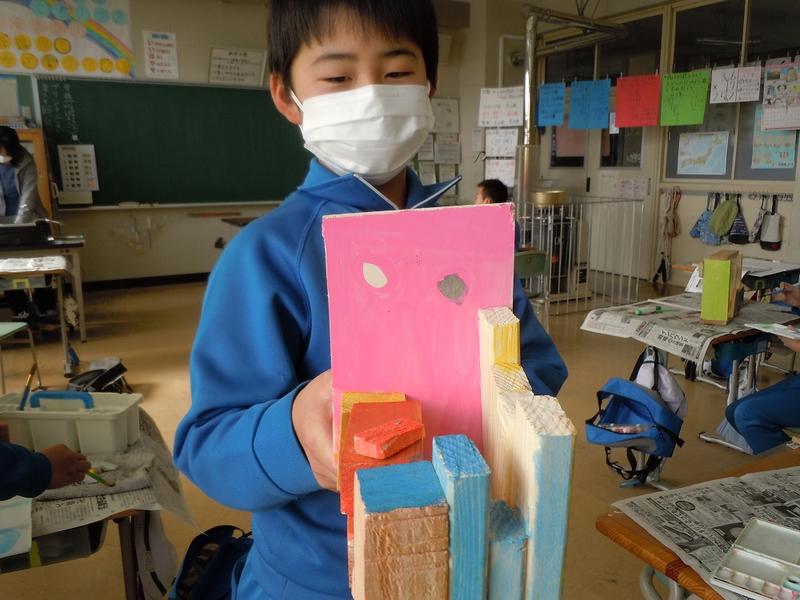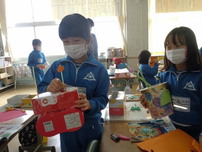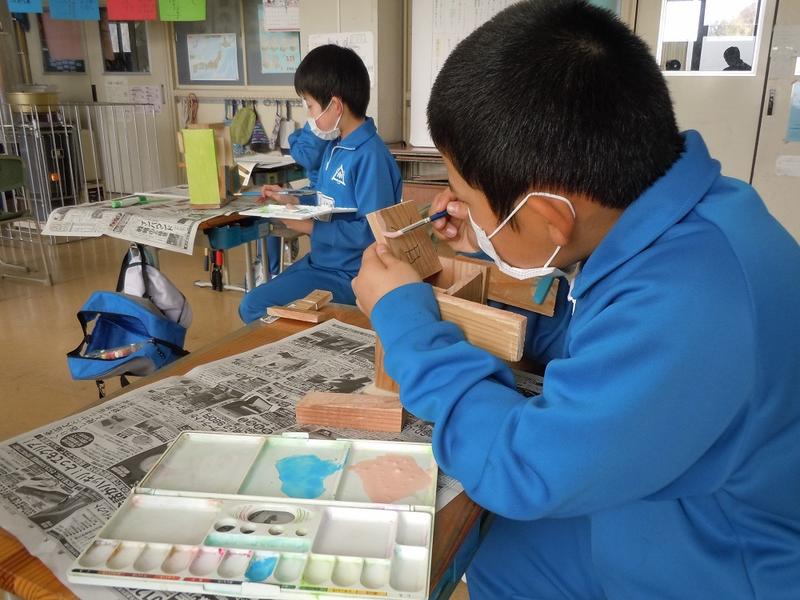 本日は、3・4年生とも大好きな図画工作の授業。3年生はカップ麺の器やティッシュボックスを利用して動くおもちゃを、4年生は木材を使って(前回の続き)・・・。