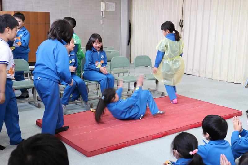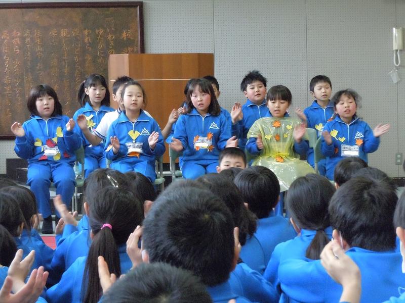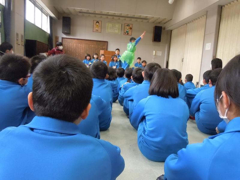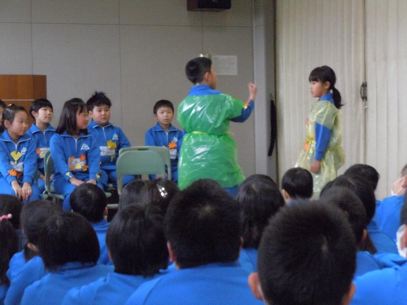 3年生の発表は,ご存じ「3年とうげ」「えんやら、えんやら、えんやらや・・・」のリズムでもお馴染みの、子ども達が大好きな民話です。この日のために国語の時間を中心に練習してきた発表は、群読はもちろん,歌あり、でんぐり返しありのミニ学習発表会となりました。
