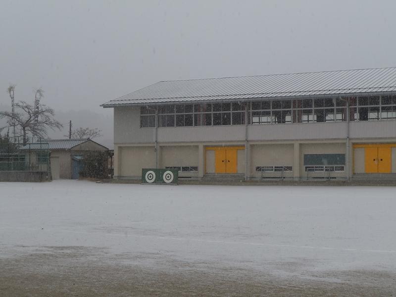 天気予報は雪。みるみる校庭が真っ白になってきました。