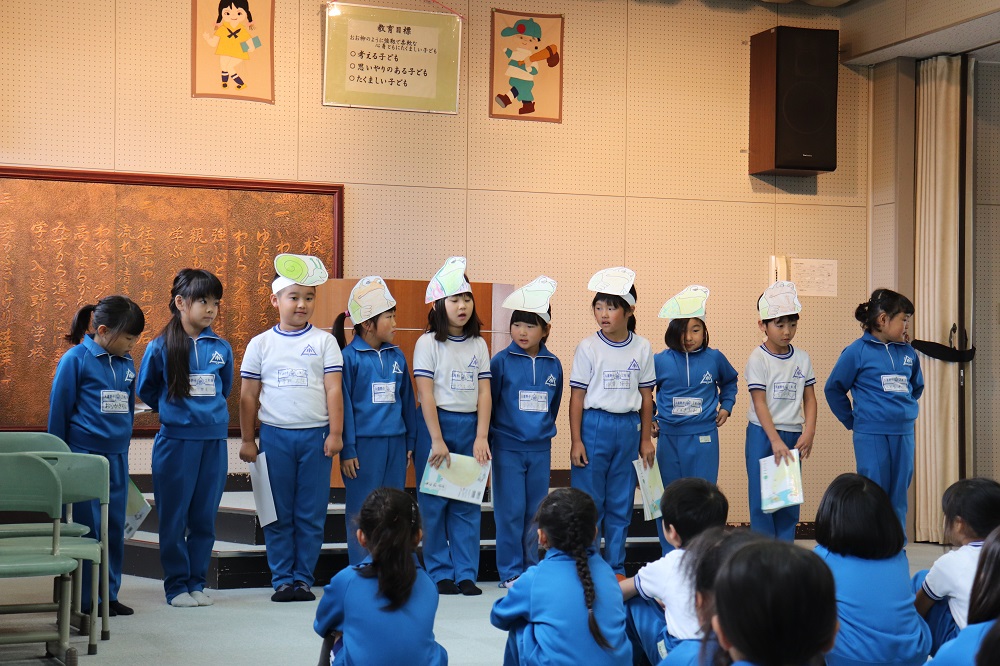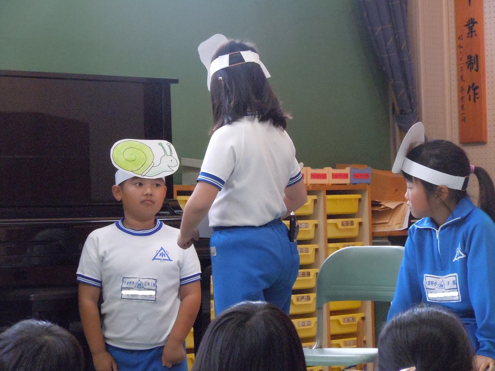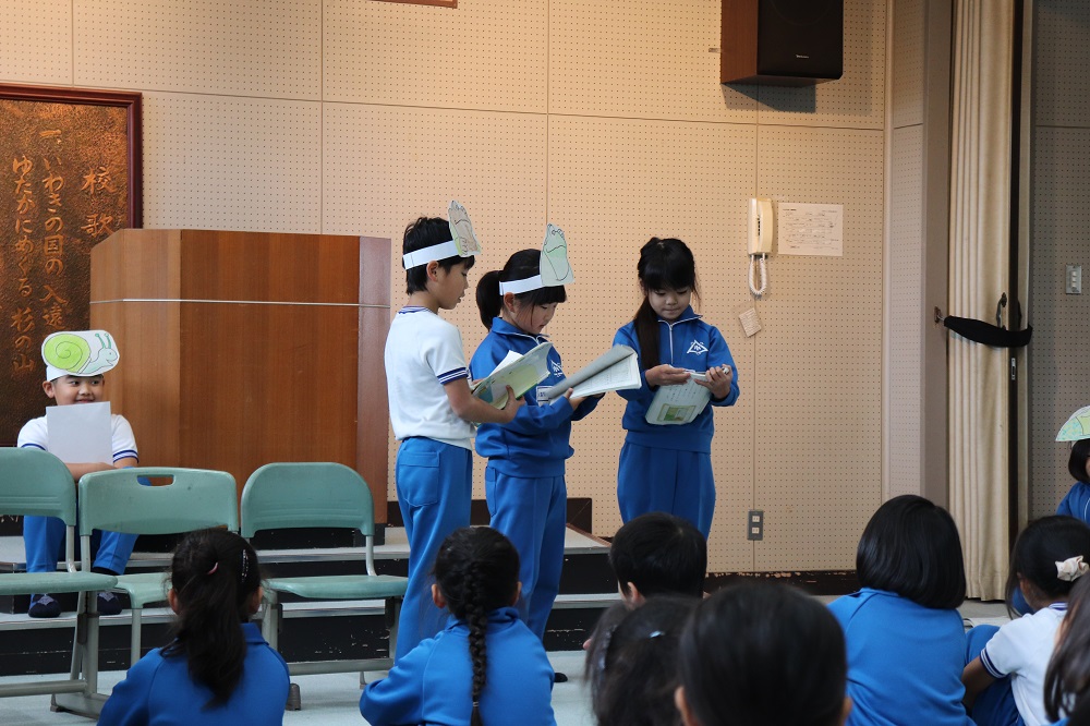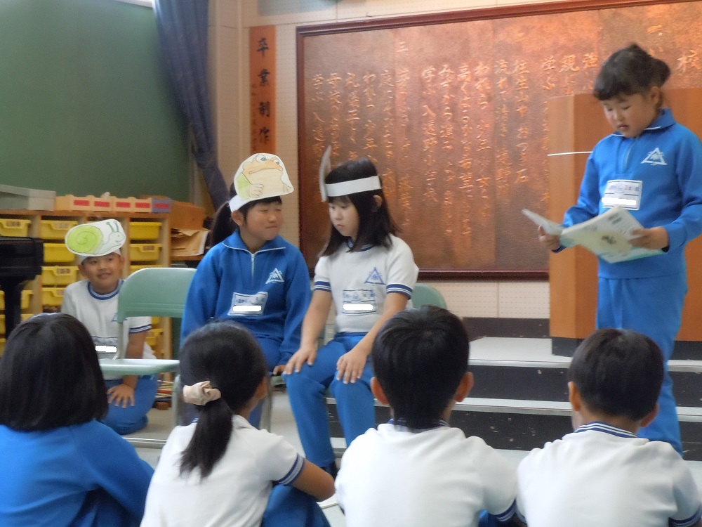 本日は2年生による発表集会。みんなが大好きなアーノルド・ローベル作「お手紙」を、2年生一人一人が、登場人物なりきって音読を発表しました。