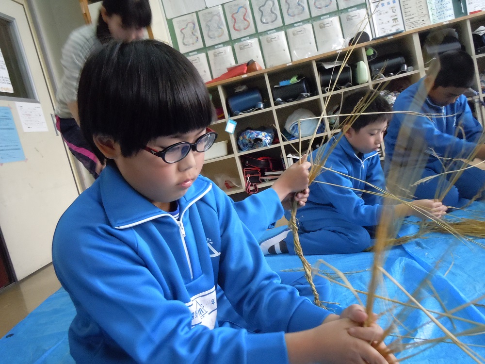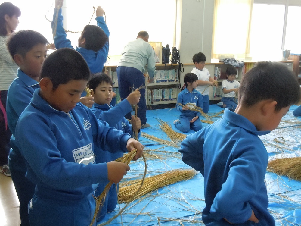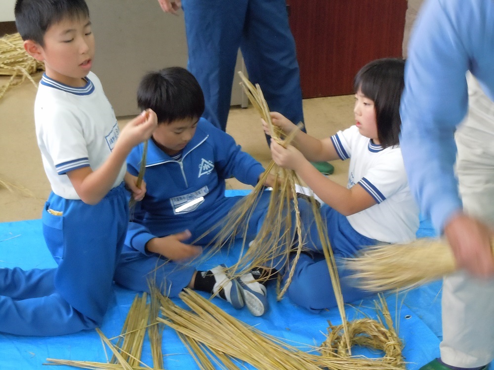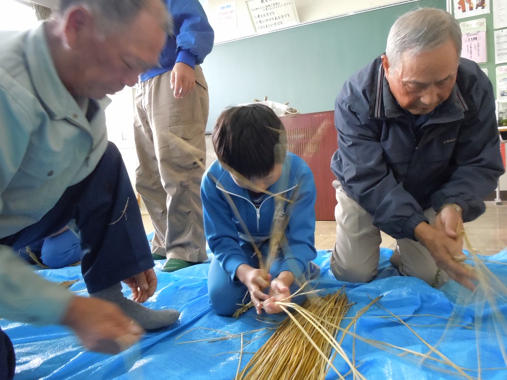 はじめは、藁を前に悪戦苦闘の子ども達でしたが、区長さん達5名の先生方による、手取足取りの手厚い指導により、おかげさまで少しずつ形になってきました。