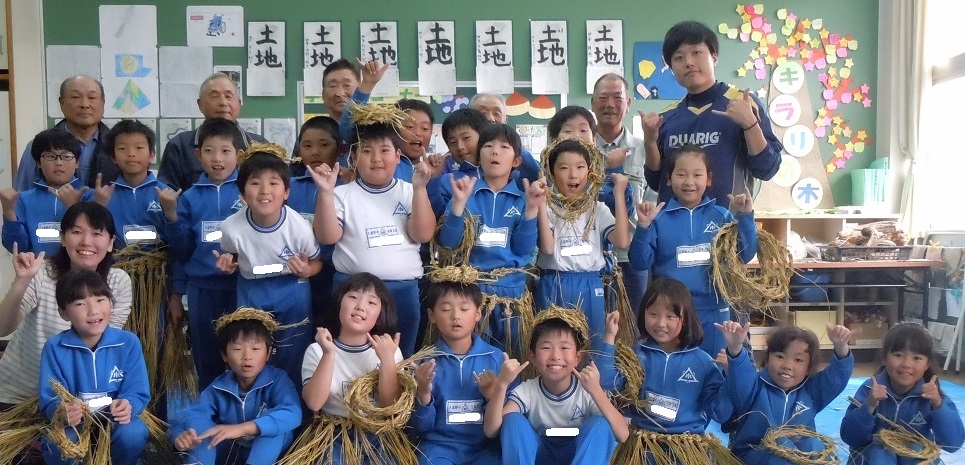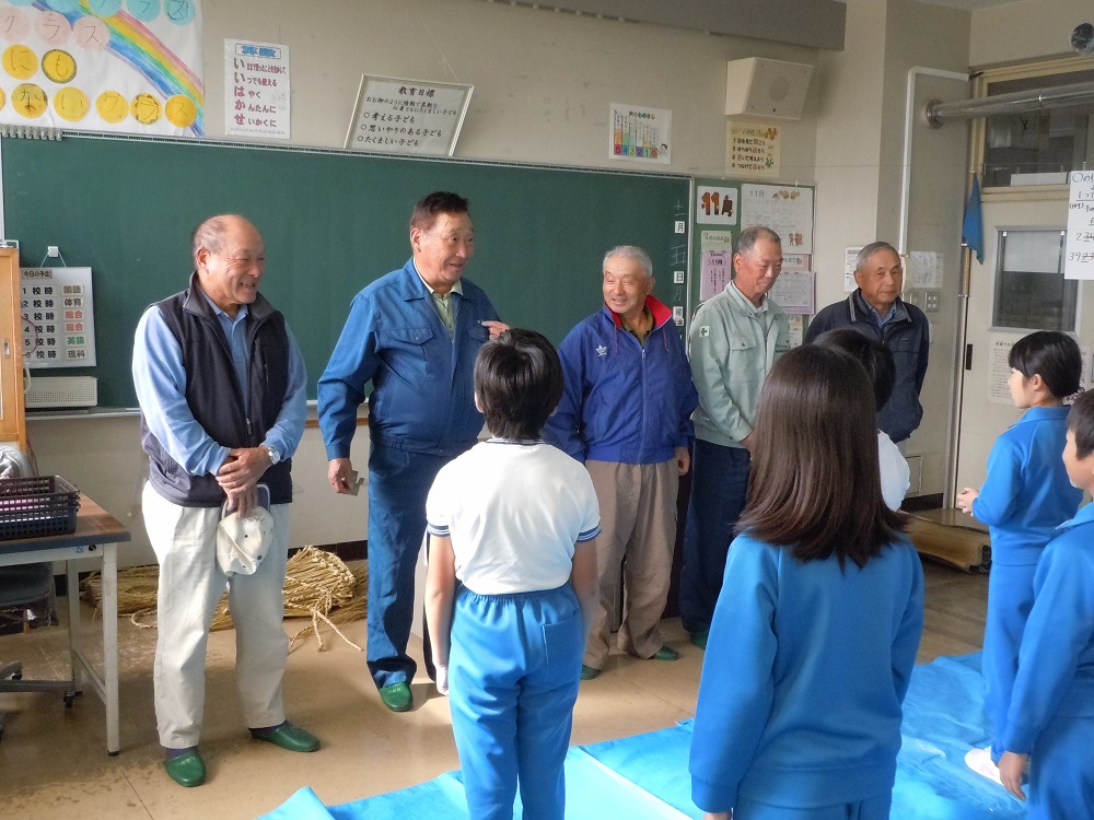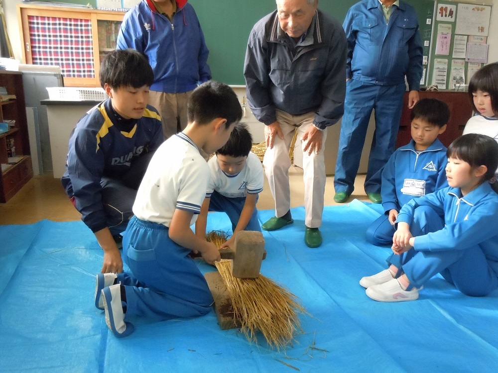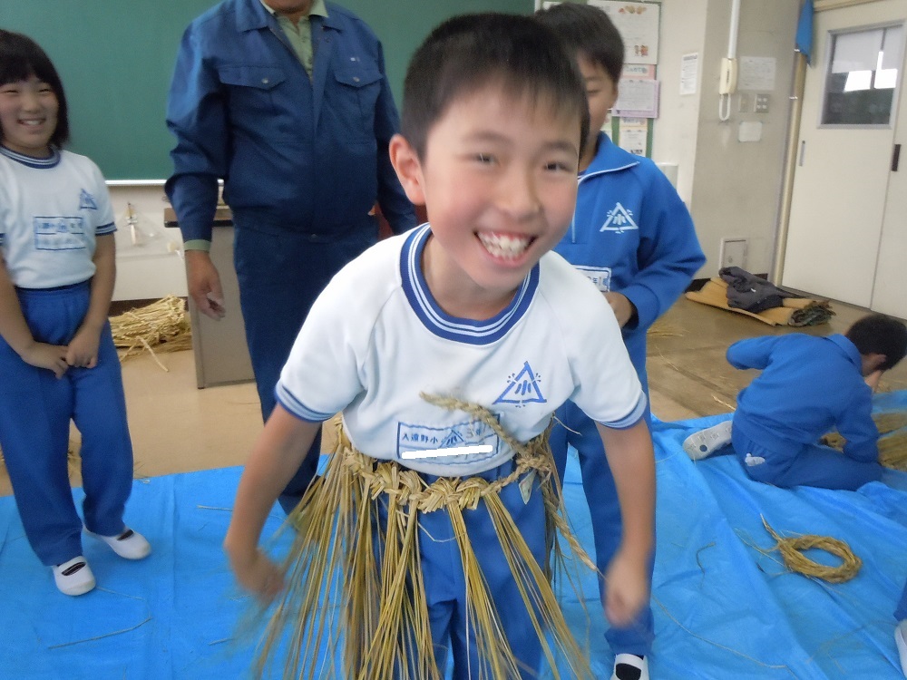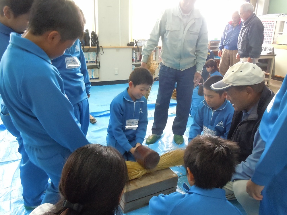 はじめは、藁を前に悪戦苦闘の子ども達でしたが、区長さん達5名の先生方による、手取足取りの手厚い指導により、おかげさまで少しずつ形になってきました。