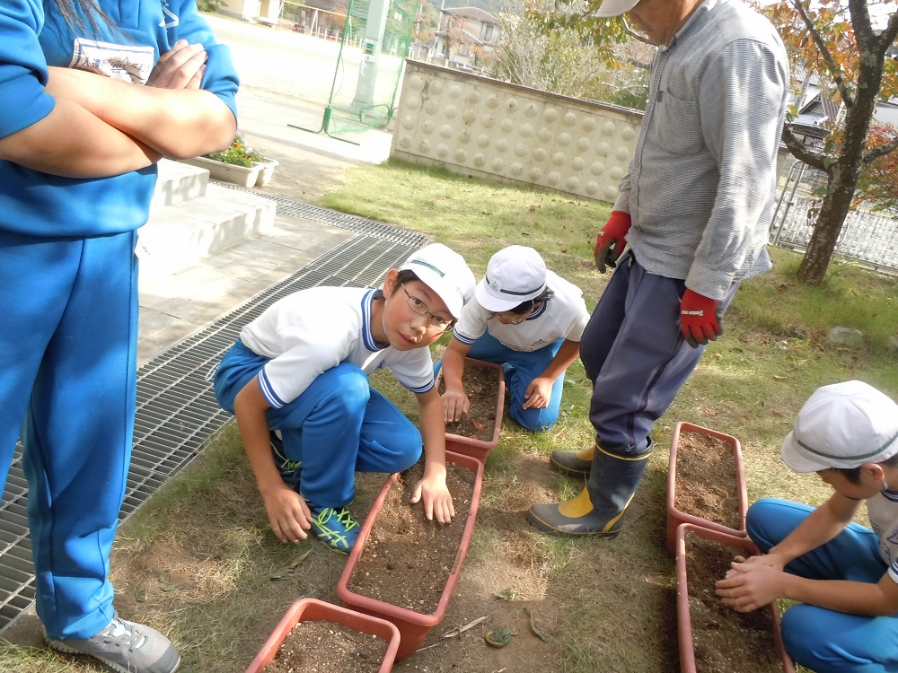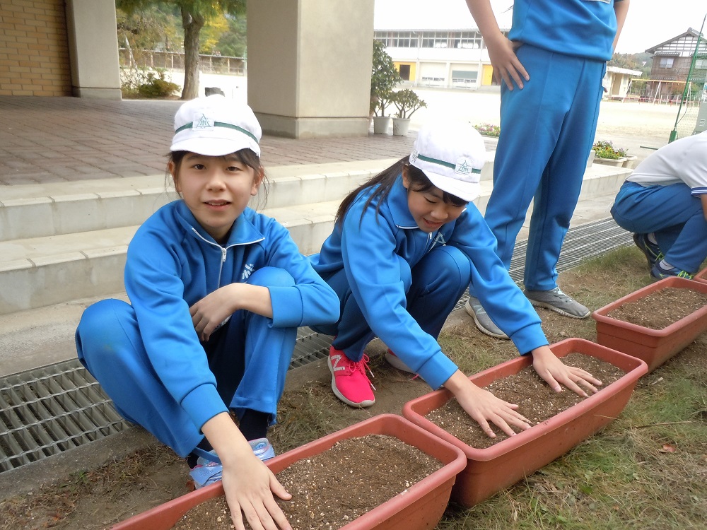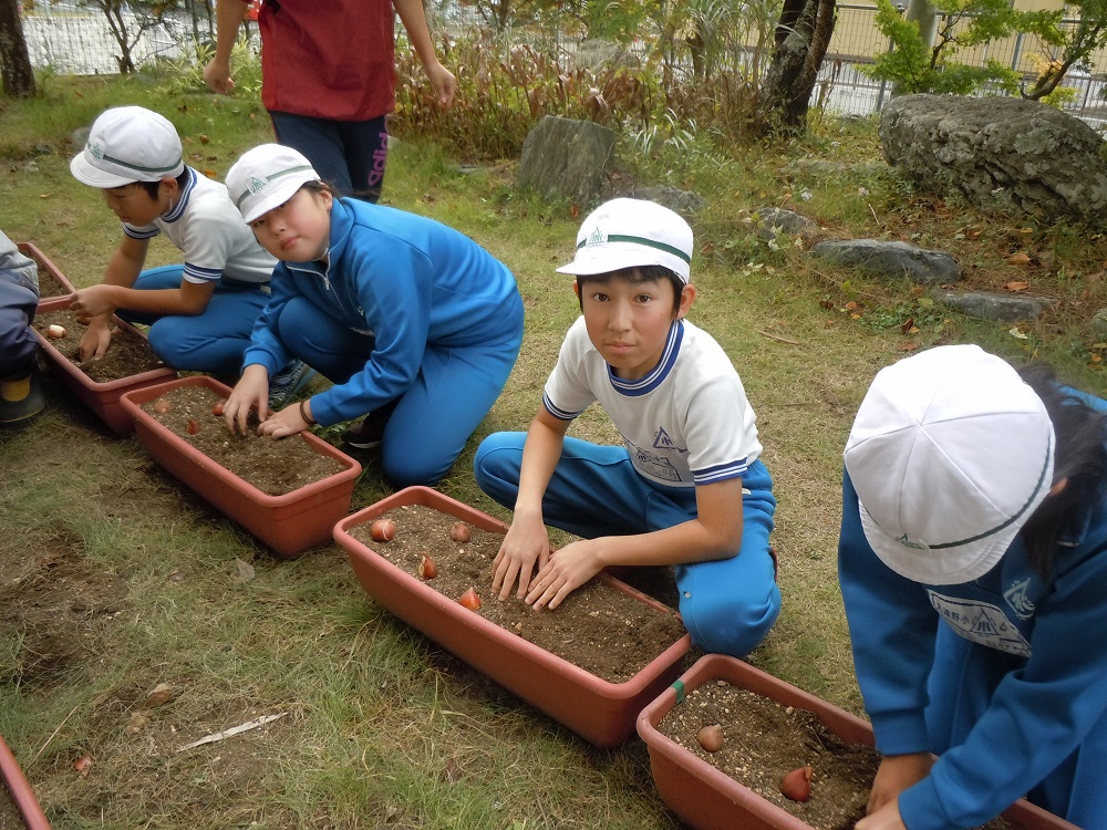 この球根が芽を出し、色とりどりの花を咲かせる頃6年生は中学生。今日の作業は在校生のための作業となります。