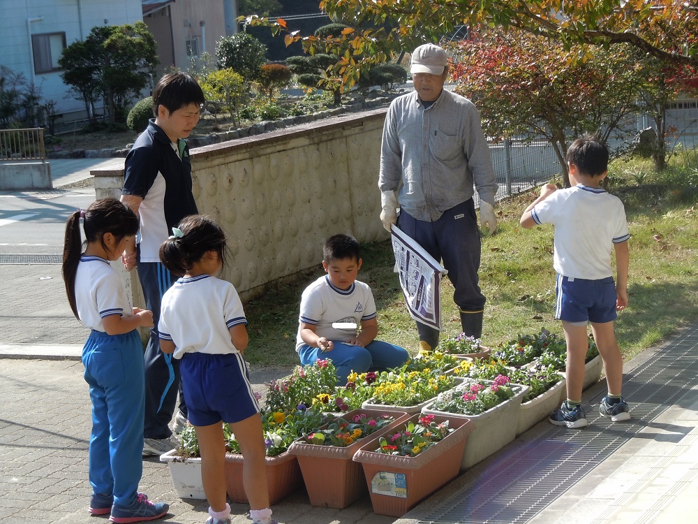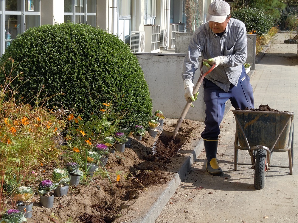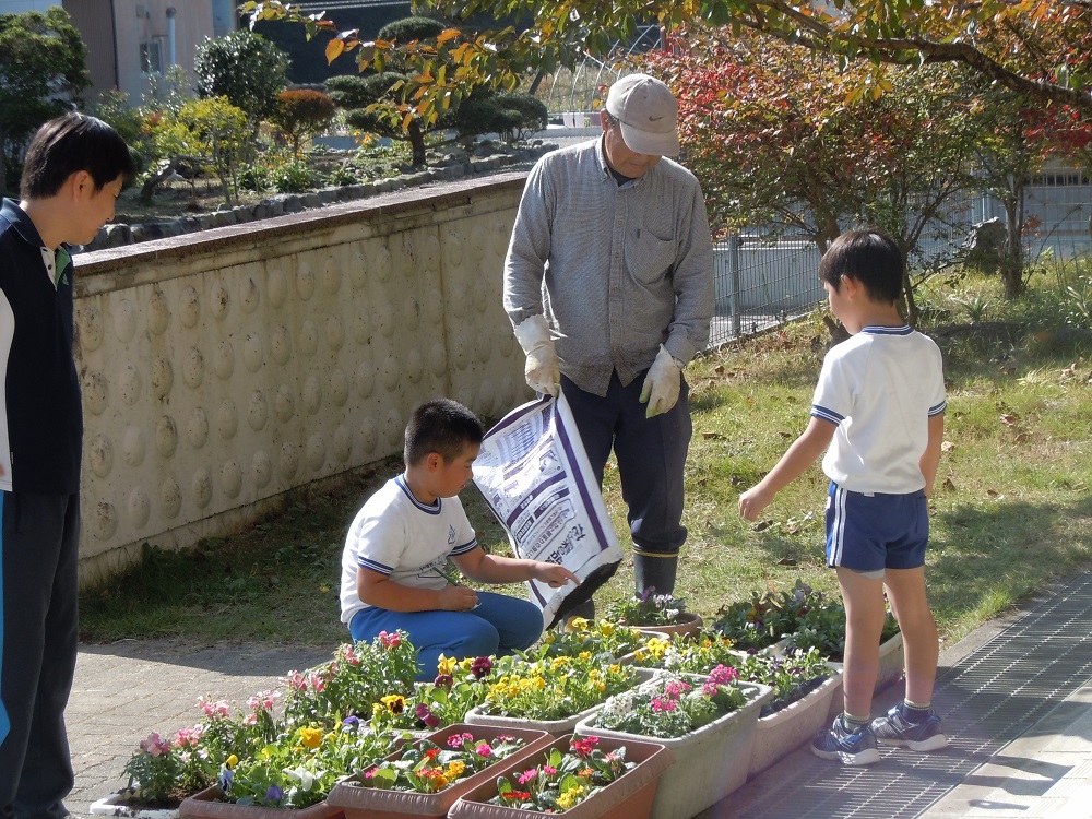 用務員さんの指導のもと、プランターへの定植作業が手際よく進みます。