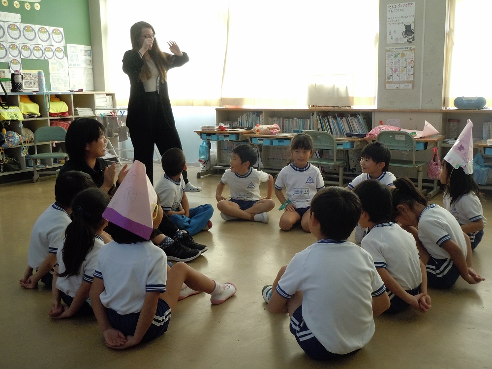 本日の1年生は,コートニー先生と一緒にハロウィンパーティー。