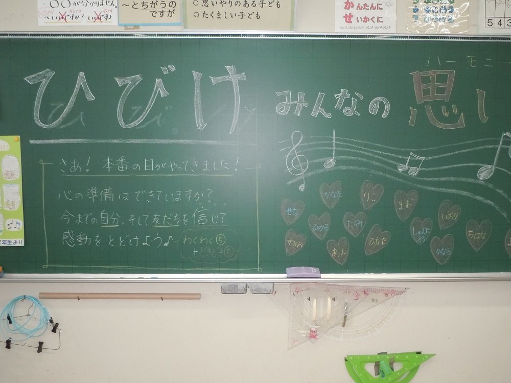 朝、3・4年生の黒板には、指導者(担任)からの励ましの言葉と1・2年生からのかわいいメッセージが添えられていました。