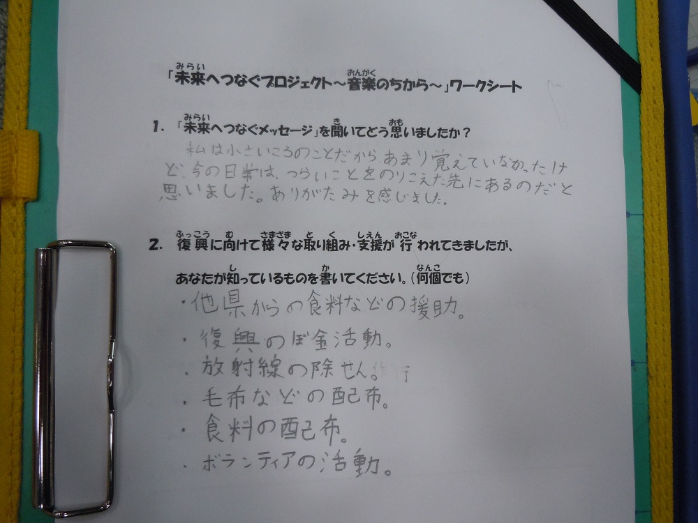 授業の終末に子ども達から、「災害を忘れずに、未来につなげていくことが大切だと思いました。」という感想が多く寄せられました。