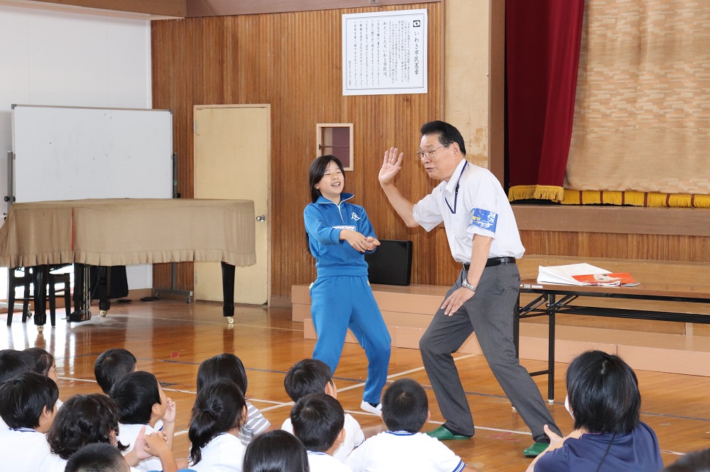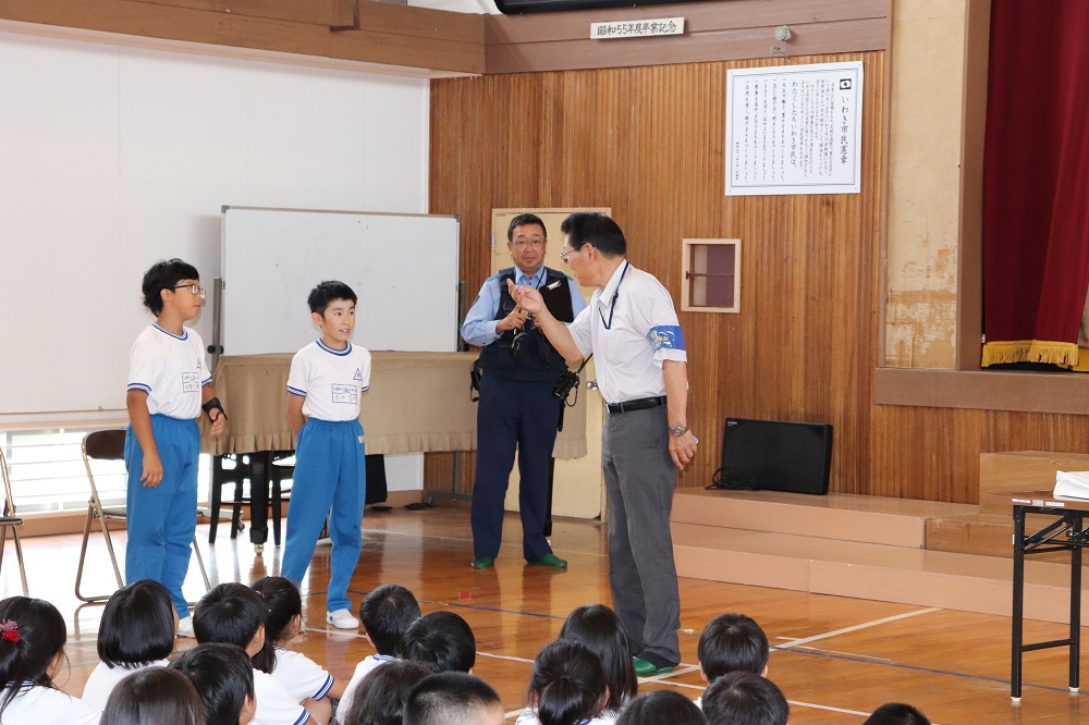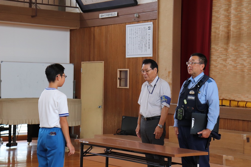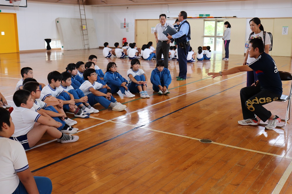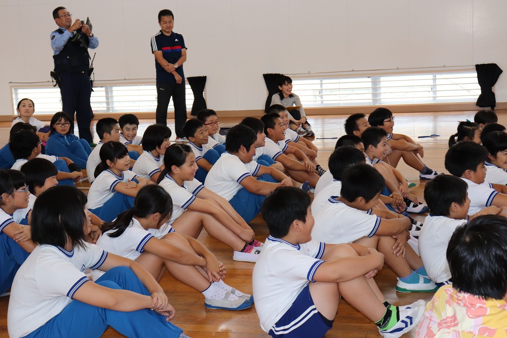 南警察署の安瀬さんとスクールサポーターの星さんを招いて、全校生による防犯教室を行いました。