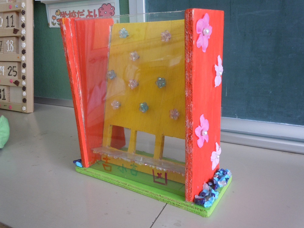 アイディ貯金箱コンクール:1年折笠好汰さん、5年根本栖恋さん。