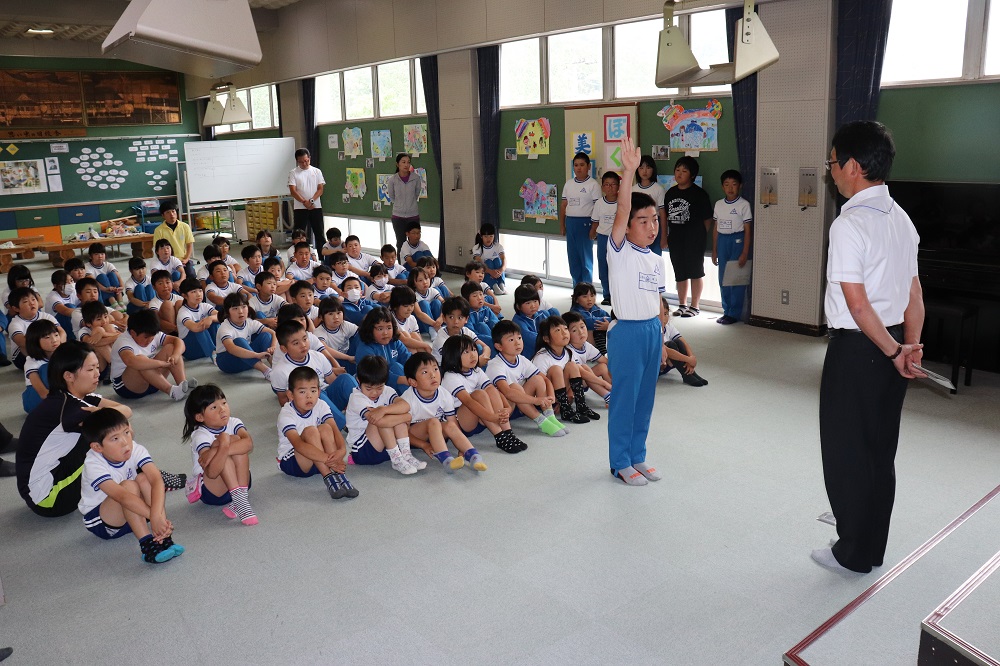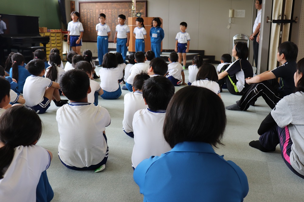 2階のみんなの広場において、プール開きを行いました。安全とルールを守って、それぞれの学年代表から今年の目標が発表されました。最後に、係の先生よりみんなで守る約束についてお話がありました。