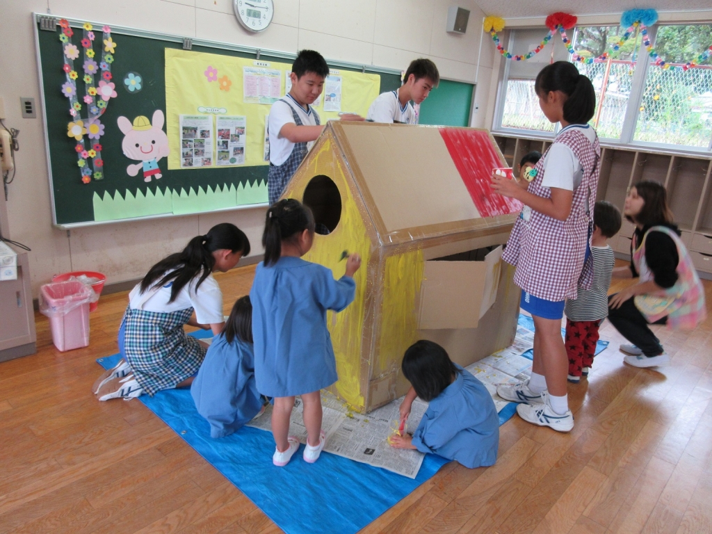 絵具を使って段ボールで作った大きなおうちに色を塗ります![]()