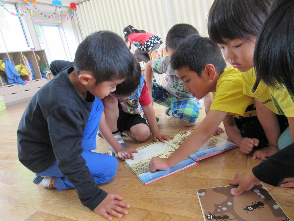 男の子たちは、みんなで恐竜の絵本に夢中になっていました![]()
