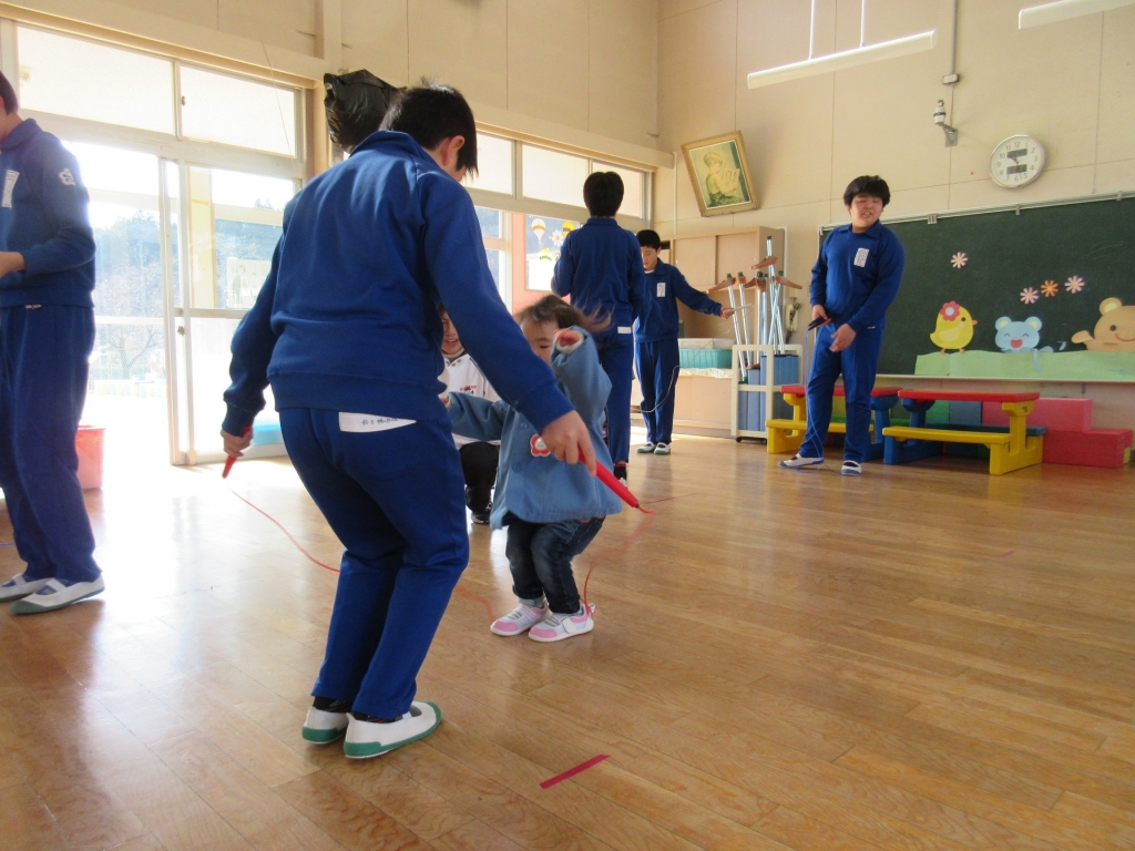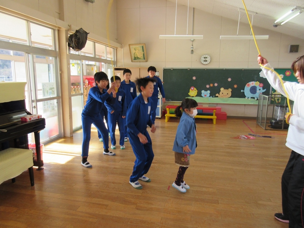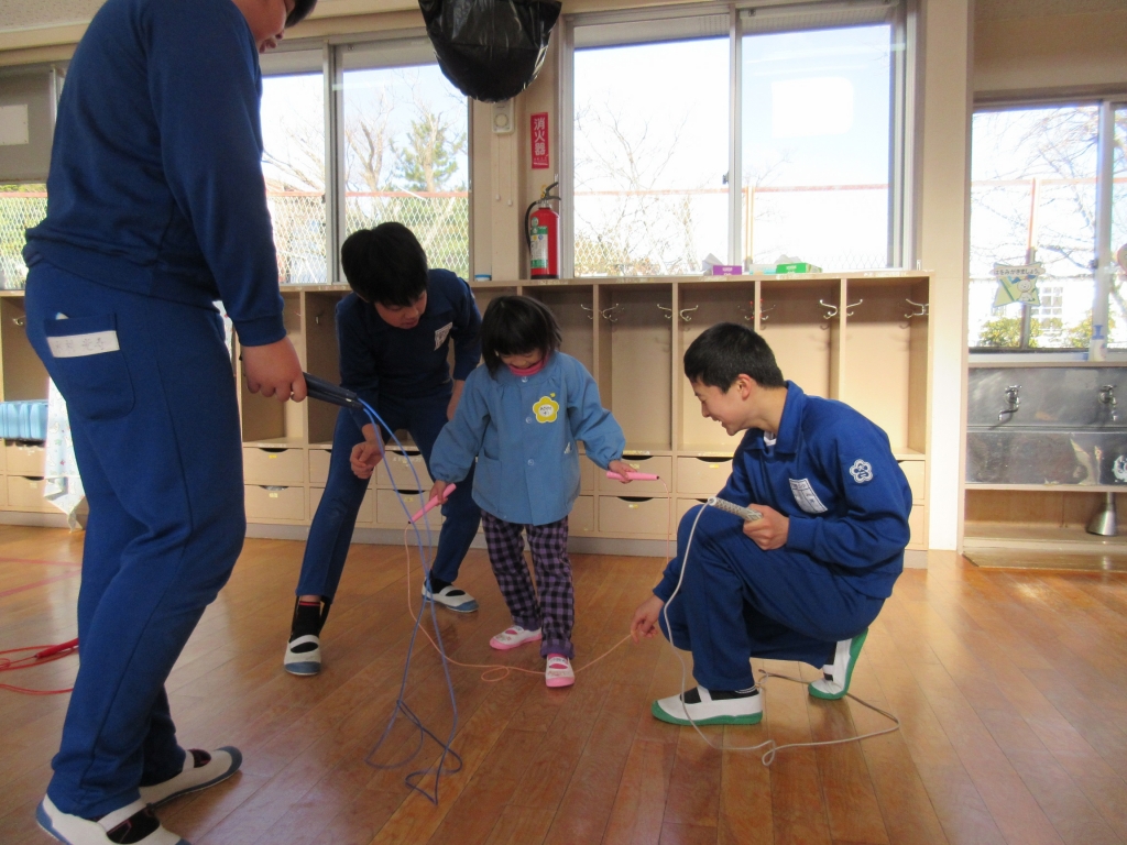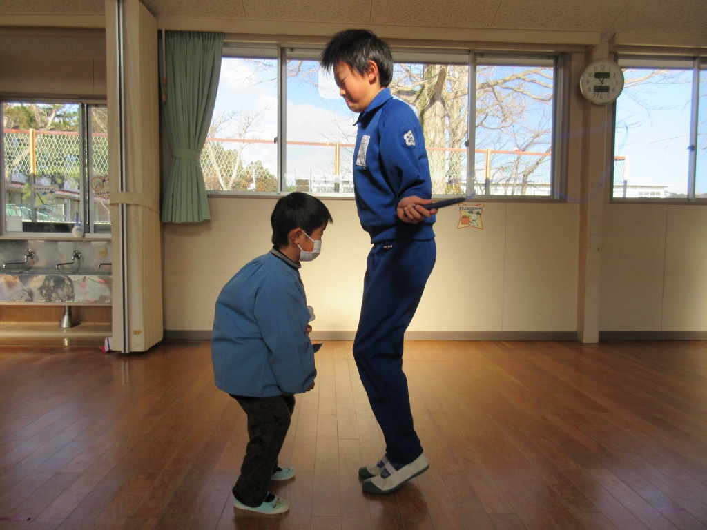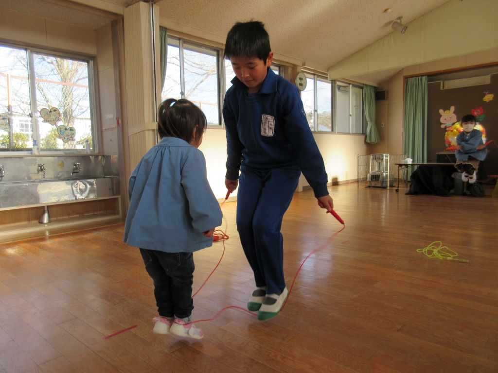2015年1月19日 14時30分 6年生のお兄さん・お姉さん7名が来園し、いろいろな縄跳びの跳び方をみせて