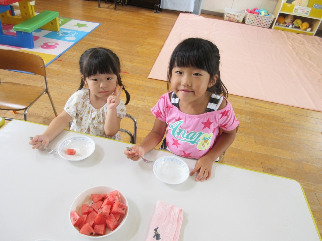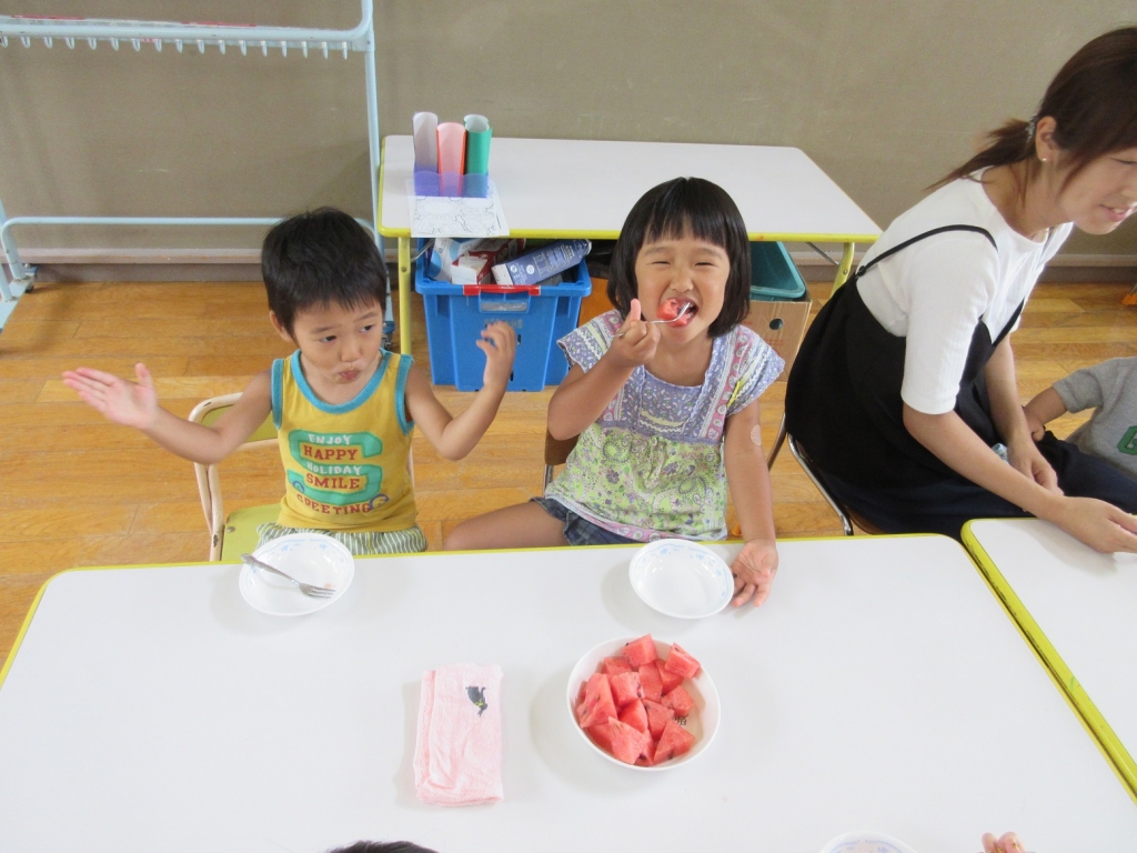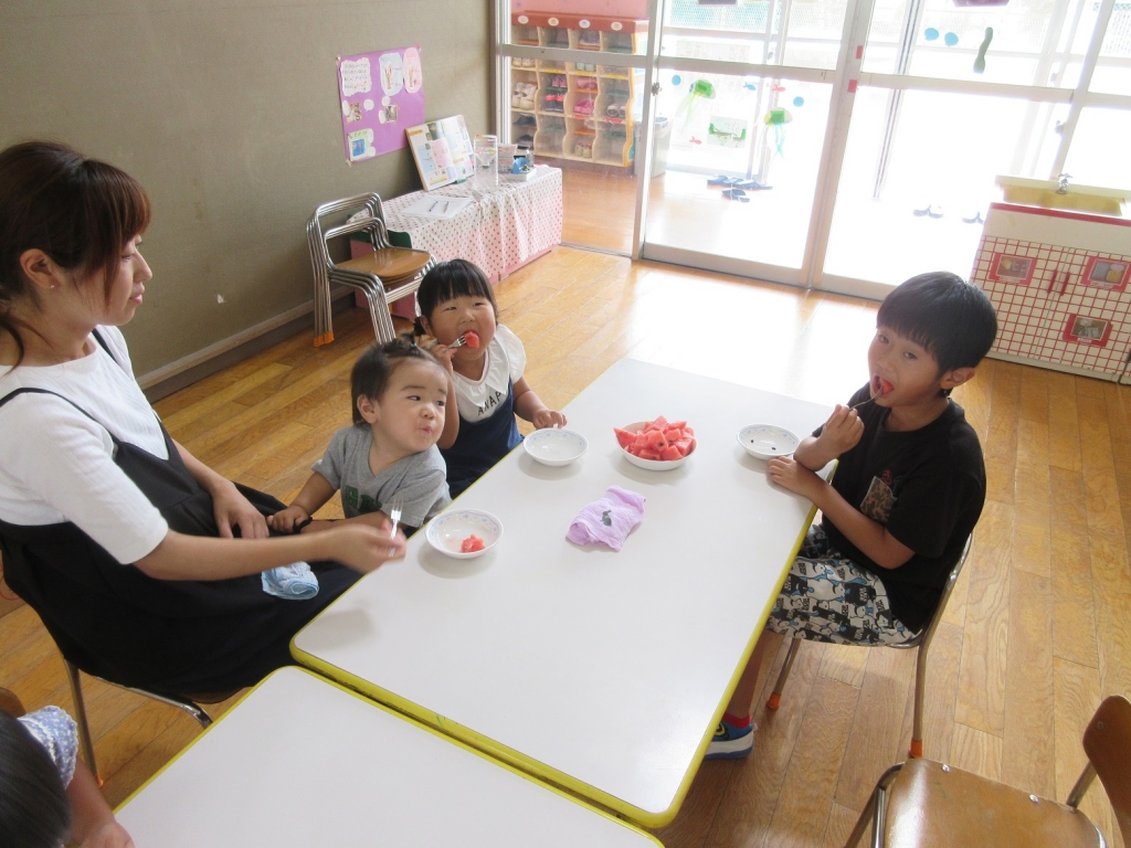 たくさん遊んだ後は、在園児のお宅からいただいたスイカを食べました❤
