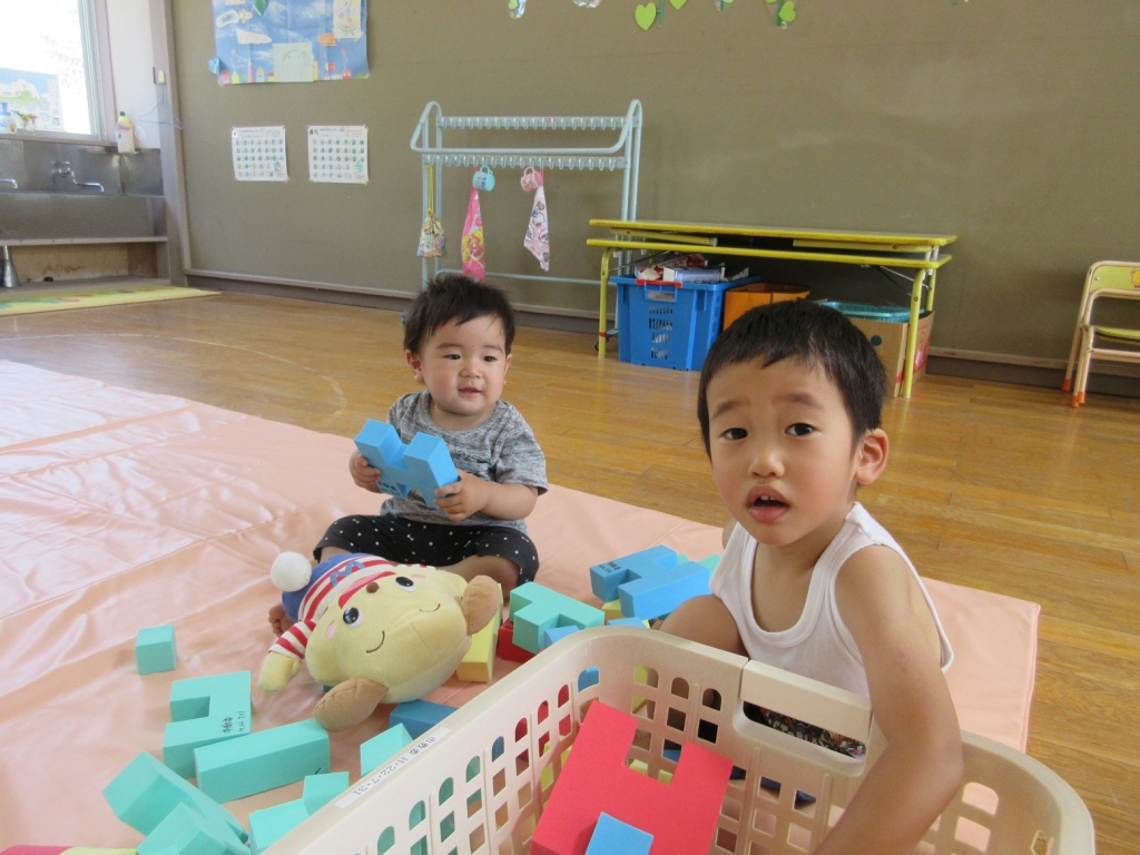 小さいお友達は涼しいお部屋でブロック遊び♪