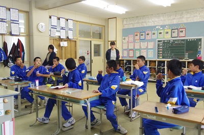 給食終了10分後に軽快なリズムの「歯みがきサンバ」の曲が流れます。