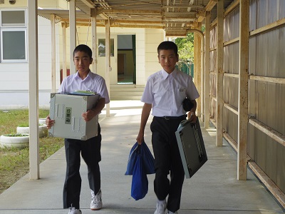 1年生が、それぞれの学年の作業場所を回って、掃除機で掃除していました。