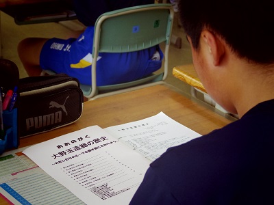 1時間目は、教室でテキストや資料を見ながら大野の歴史について学びました。