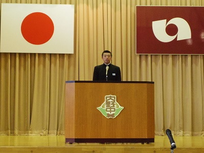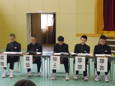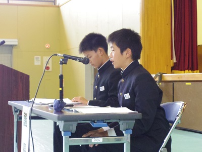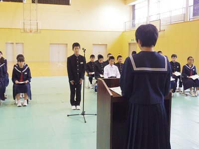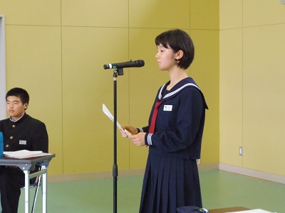 「このテーマには、全校生の心を一つに協力し合い、日々の学校生活を送り、毎日笑顔で過ごせる学校にしよう、という想いがこめられています。皆さんが今日の総会で、大野中の生徒会活動をより深く理解し、今後の活動につなげることで、大野中の生徒会がより発展する良い機会になることを期待し、会長の挨拶とします。」