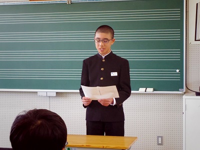 「僕たち3年生は、今日までみんなで話し合いを通して、よりよい修学旅行をすることを考えてきました。スローガンにあるように、この修学旅行で『一人ひとりが判断力を身につけて、先の見通したクラス』にできるように、みんなで仲良く、集団行動の大切さを学べるように一人ひとりが意識して、この三日間を活動したいと思います。」