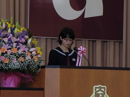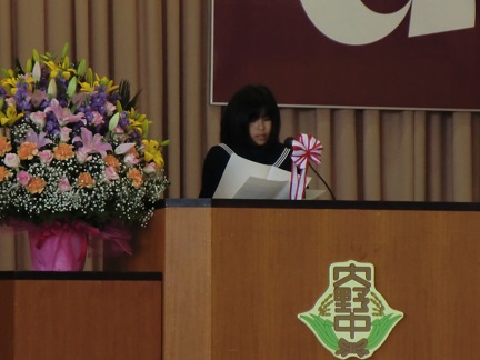 この二つの目標を実現するために日々目標を意識して学校生活を送っていきたいと思います。そして、今日から私は先輩という立場になり、後輩ができます。少し不安もありますが、一年間、私が先輩方に教わった大野中のあいさつや先生、先輩方に対する態度と言葉使いなどを新1年生に優しく教えてあげたいと思います。後輩に信頼してもらえるような先輩になれるよう頑張ります。」