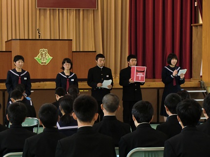写真左はじの会長が持って上に掲げているのは、本校生徒会のマスコットです。
