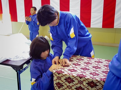 敷いたら中の空気を抜きながら、3年生がぞうきんをかけました。